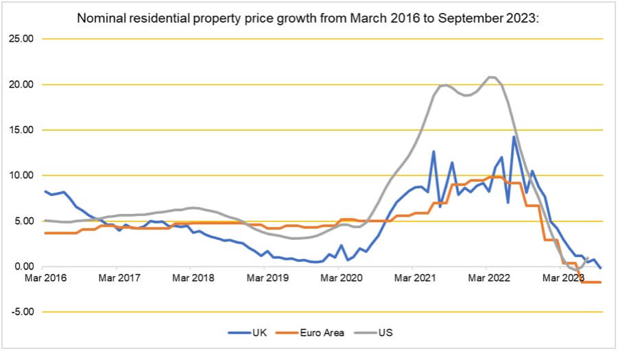 These higher interest rates, whether sustained or not, are poised to reverberate across the global financial system. The report underscores potential ramifications, including an increase in global risk aversion leading to marked-to-market losses on banking assets, particularly in the global commercial real estate (CRE) market, which has seen a 10% year-on-year decline in aggregate prices in both Europe and the U.S. and looking at global residential prices in recent years since March 2016: