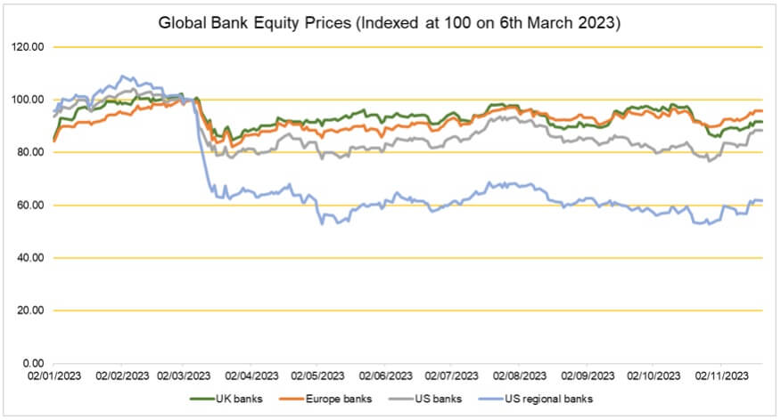 Source: William John Analytics, Bank of England, FTSE UK Banks Index, Stoxx Europe 600 Banks Index, S&P 500 Banks Index, KBW Regional Banking Index