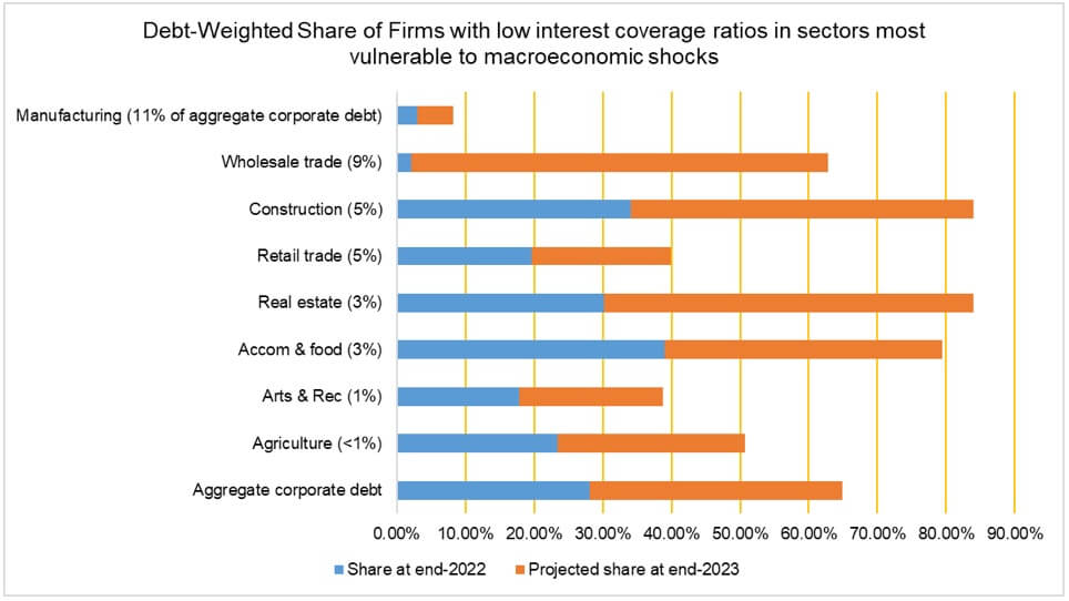 Some sectors, like wholesale trade and real estate, face rising debt-weighted shares of firms with low ICRs, indicating increased vulnerability. However, these sectors constitute a small proportion of aggregate corporate debt.